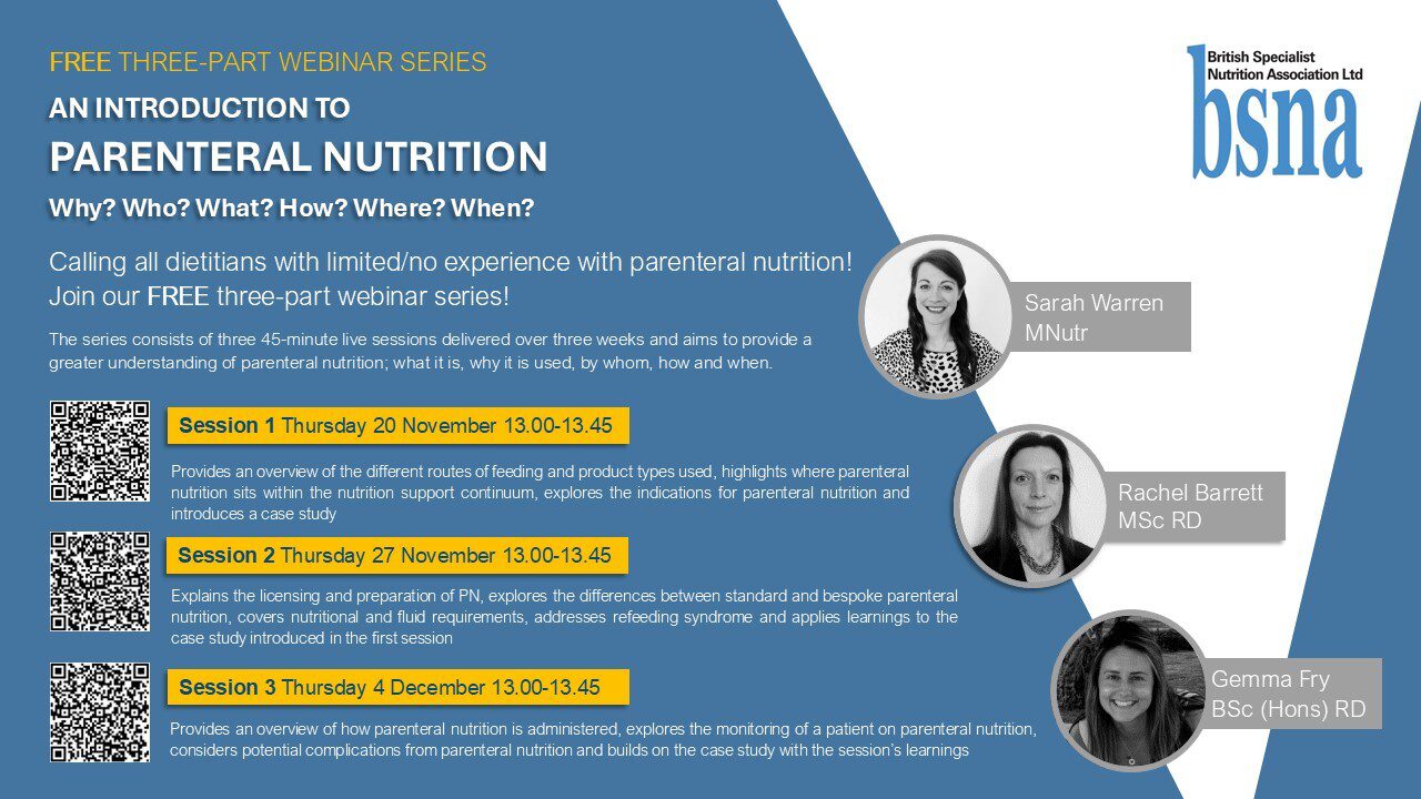 BSNA is hosting a three-part educational webinar series designed specifically for dietitians with limited or no experience of parenteral nutrition (PN), exploring the fundamentals and clinical application of PN with the aim to provide a greater understanding of PN; what it is, why it is used, by whom, how and when. Delivered by experts in the field, this series will equip you with essential knowledge and confidence in managing PN as part of multidisciplinary care.