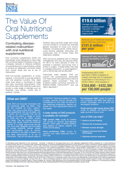 ONS can play an important role in supporting patients with malnutrition. Affecting at least 3 million people in the UK, the health and social expenditure for malnutrition is estimated at £19.6 billion per year in England alone. NICE has calculated that the delivery of better nutritional care could be the fifth largest potential cost saving available to the NHS.